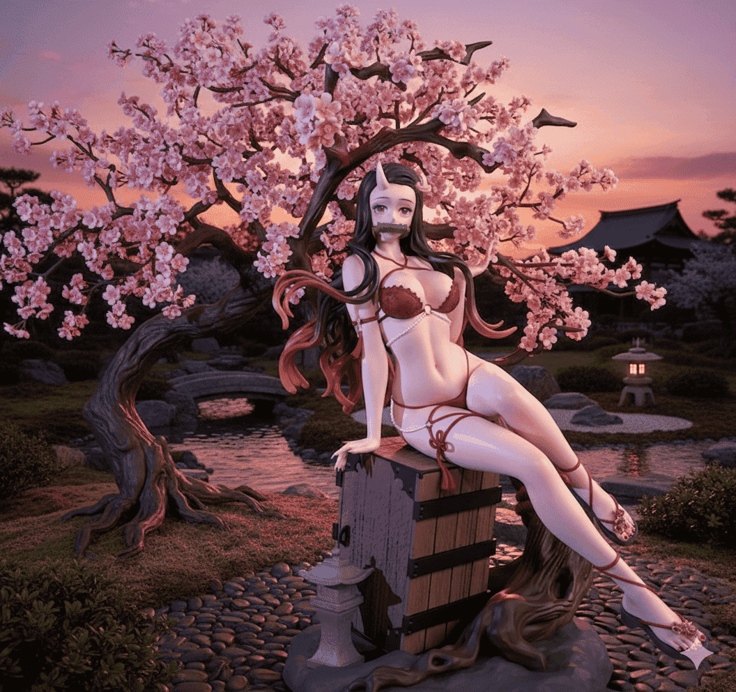 A 3D-rendered collectible figure of Nezuko Kamado in her mature demon form, sitting on her wooden travel box beneath a blooming cherry blossom tree. She is dressed in a stylized red-and-gold bikini with pearl accents. The scene is set in a traditional Japanese Zen garden during a warm, golden sunset.